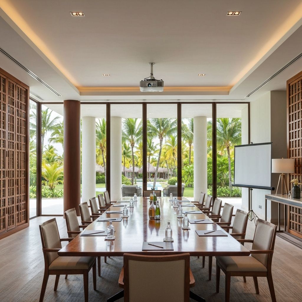 Morning conference sessions in resort facilities. Afternoon water sports or spa. Evening gala with live merengue music.